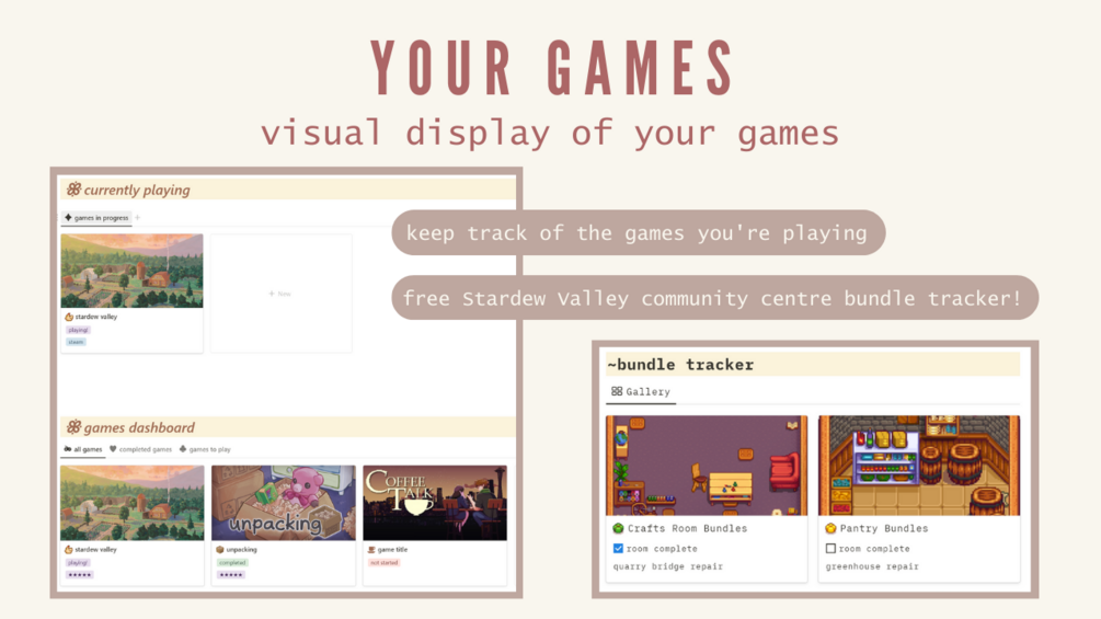 A Stardew Valley themed Notion life planner template filled with familiar icons and art from the iconic game!